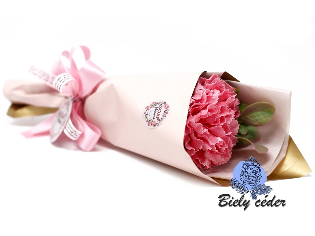 Jemný mydlový kvet zabalený v elegantnom kužeľovom obale, doplnený dekoratívnou stužkou, pôsobí ako skutočná kvetina z kvetinárstva. Na prvý pohľad očarí detailným spracovaním a romantickým vzhľadom.