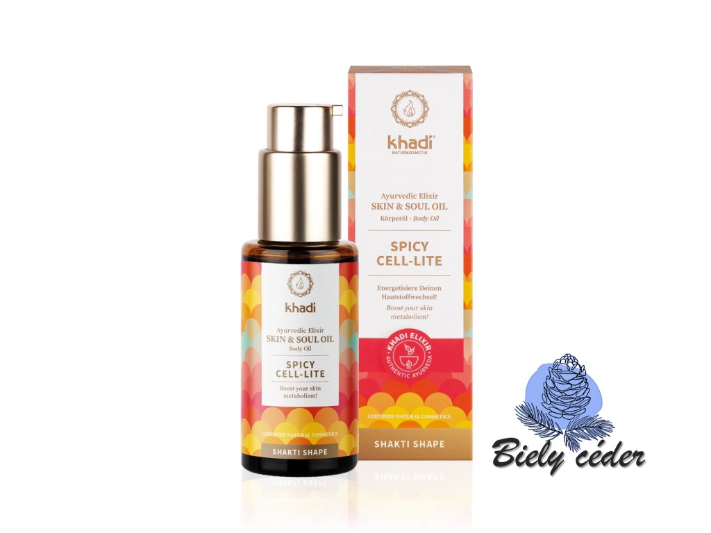 Khadi elixír olej Spicy Cell-lite: oslobodzuje oheň, ktorý prestúpi problémové partie Vašej pokožky. Khadi elixír olej Spicy Cell-lite "nakopává" látkovú výmenu v pokožke a uvoľňuje odpadové metabolity nazbierané v tukových vankúšikoch.