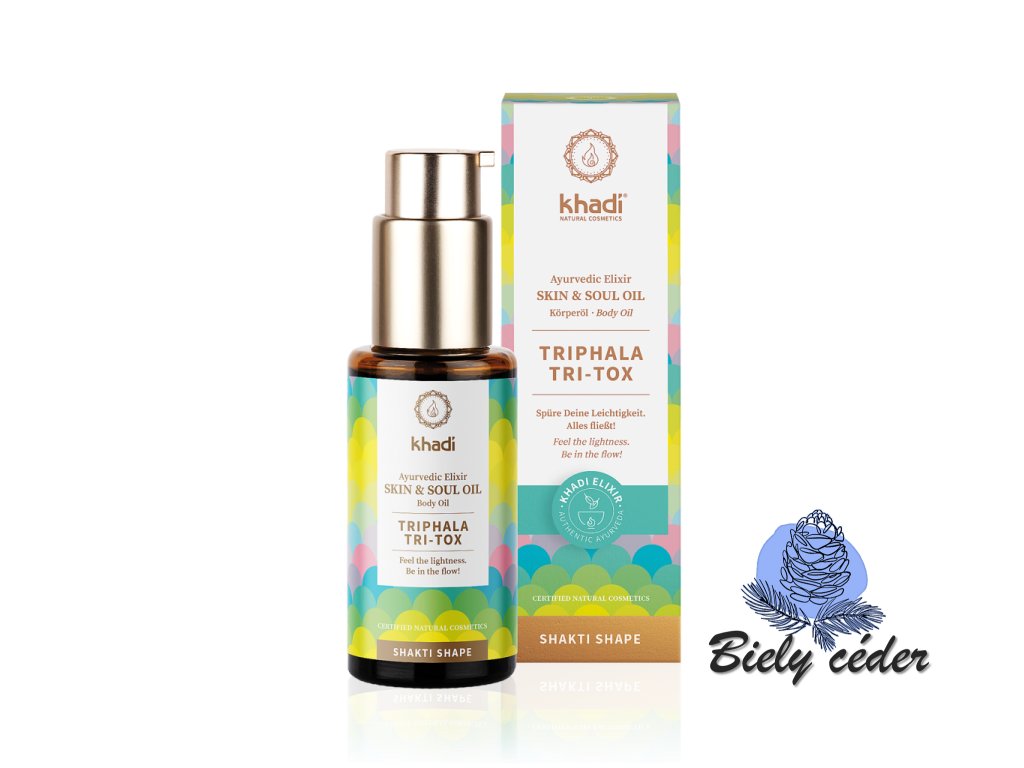 Khadi elixír olej Triphala Tri-tox je súčasťou série "Shakti Shape", ktorú tvorí spolu s Khadi elixír olejmi Spicy Cell-lite a Centella New-cell. Shakti je indická bohyňa a symbolizuje prapôvodnú silu univerza. Khadi séria Shakti Shape sa venuje telesným partiám, ktoré si vyžadujú o niečo viacej pozornosti a novú energiu. Tieto elixír oleje pomáhajú pokožke, aby znovu našla svoju rovnováhu a načerpala novú silu. Khadi elixír oleje pre pokožku a dušu pôsobia na pokožku ako hudba na dušu.